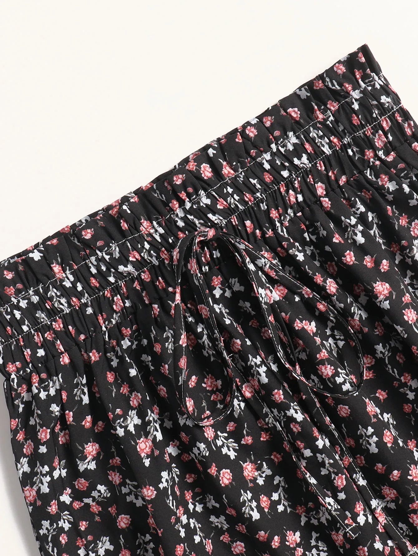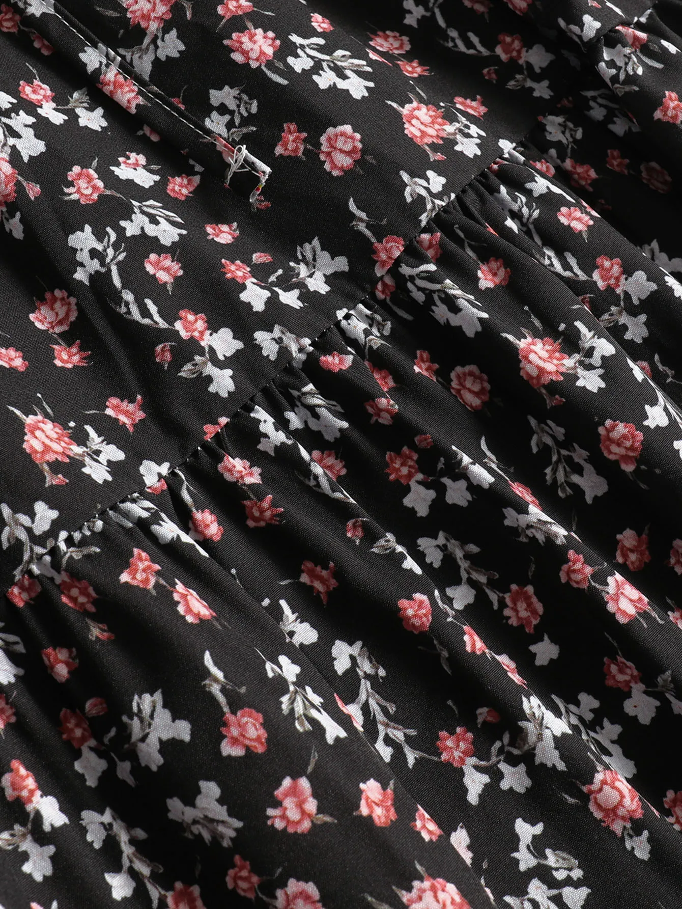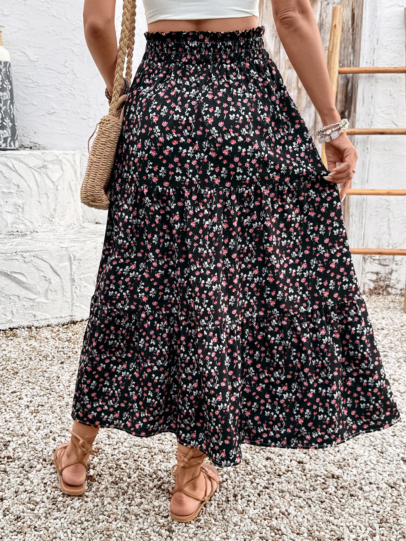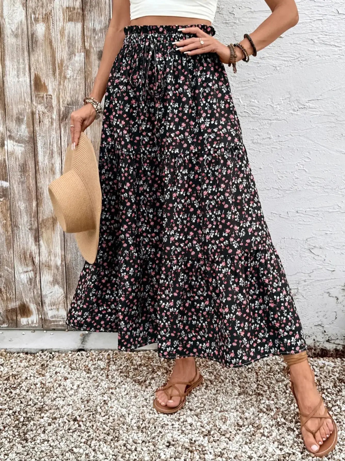 2025 New Black Base Small Floral Print Maxi Skirt High Waist Drawstring Elastic Waist Tiered Skirt Vacation Style