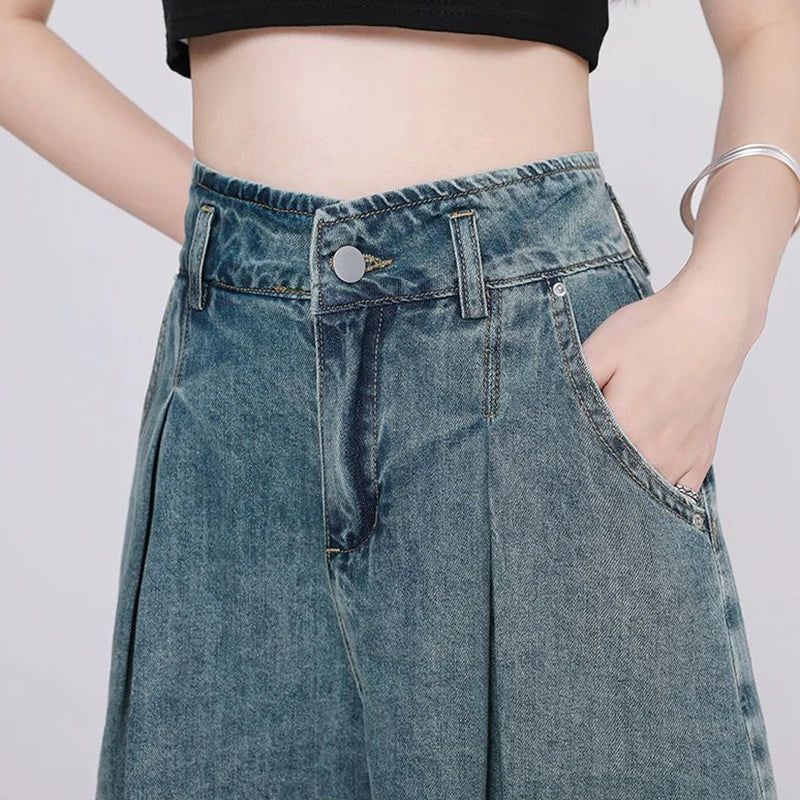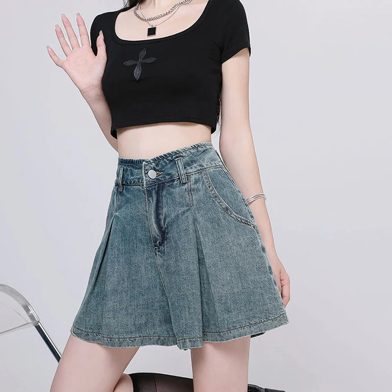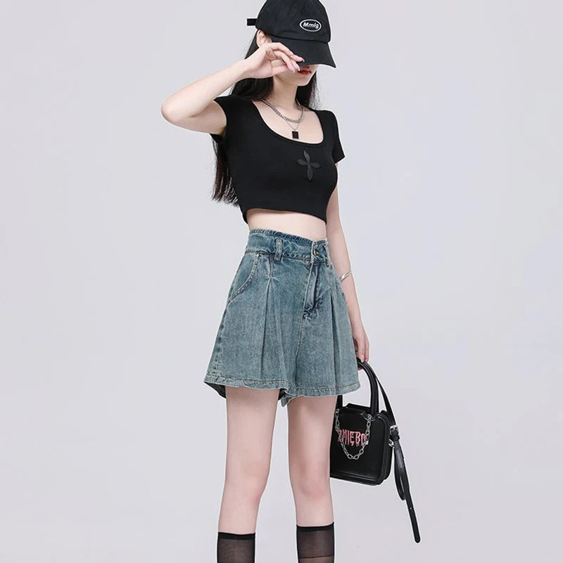 Korean Casual High Waisted Pleated Denim Shorts For Women Spring Summer Baggy Jeans Shorts Y2k A-Line Wide Leg Jeans