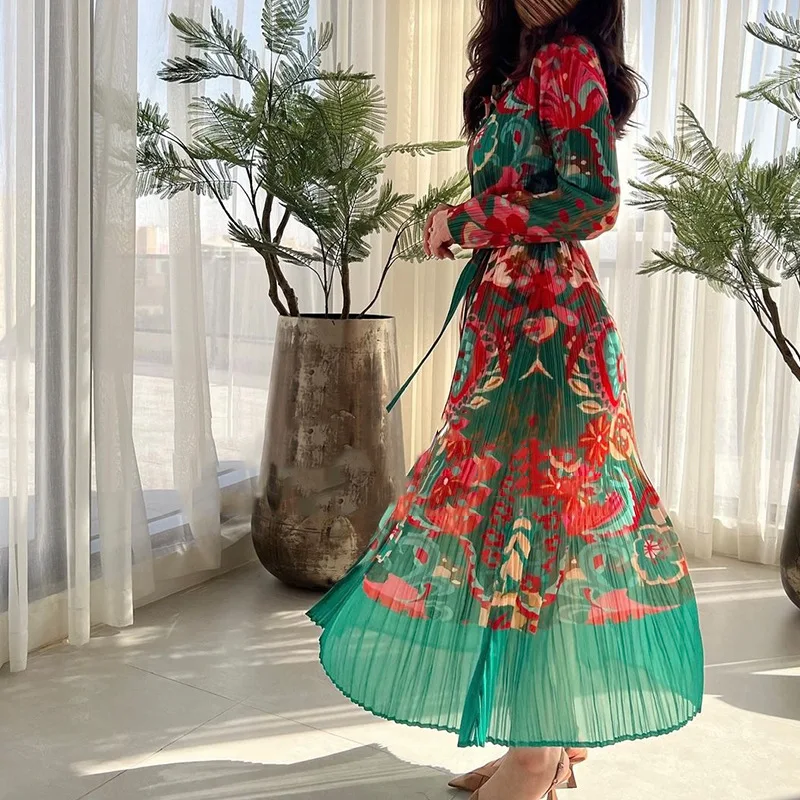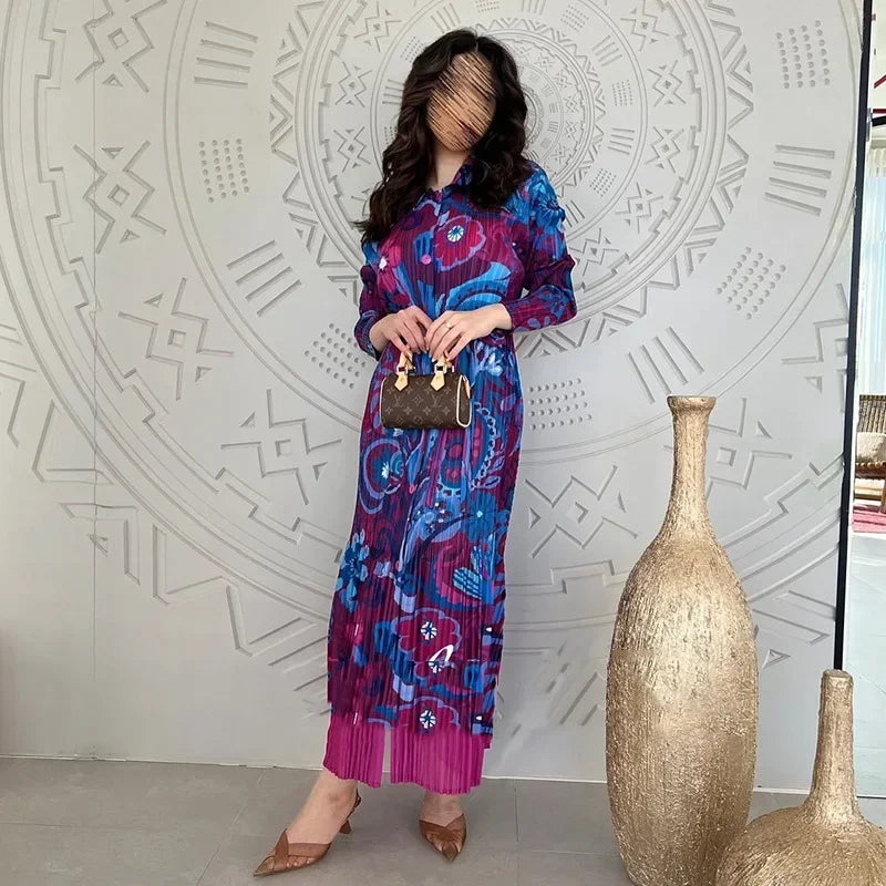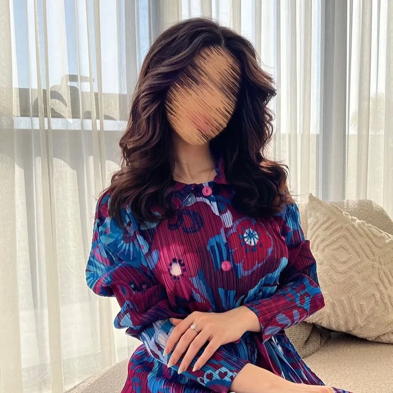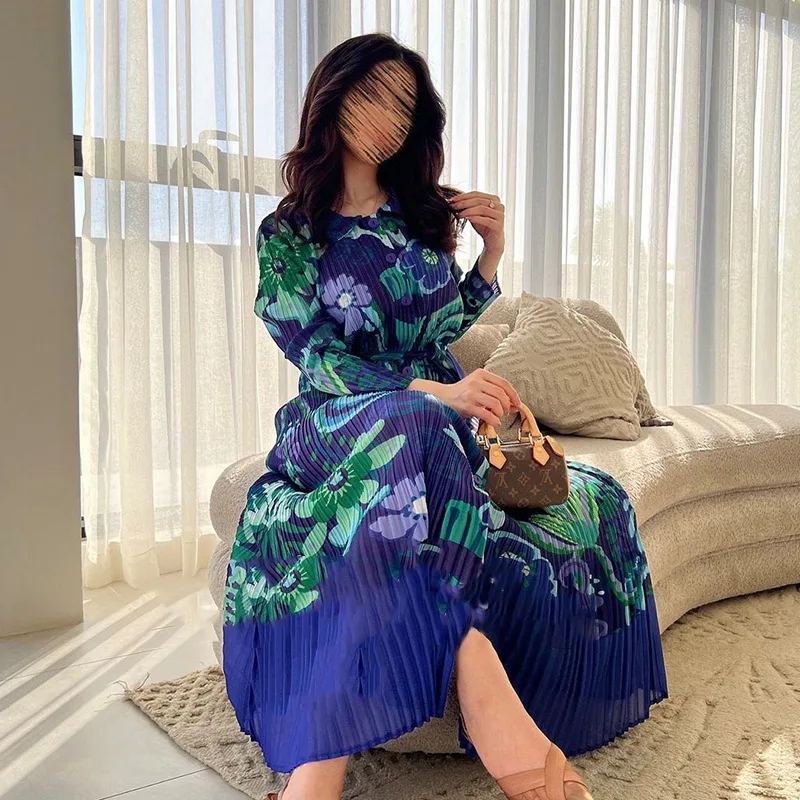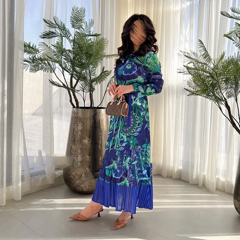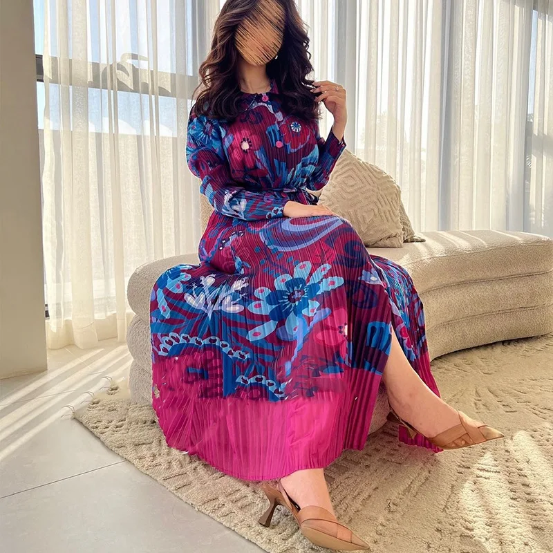 Miyake Pleated Dress 2024 Autumn New Loose Long Sleeved Printed Patchwork Mid Length Dress Summer