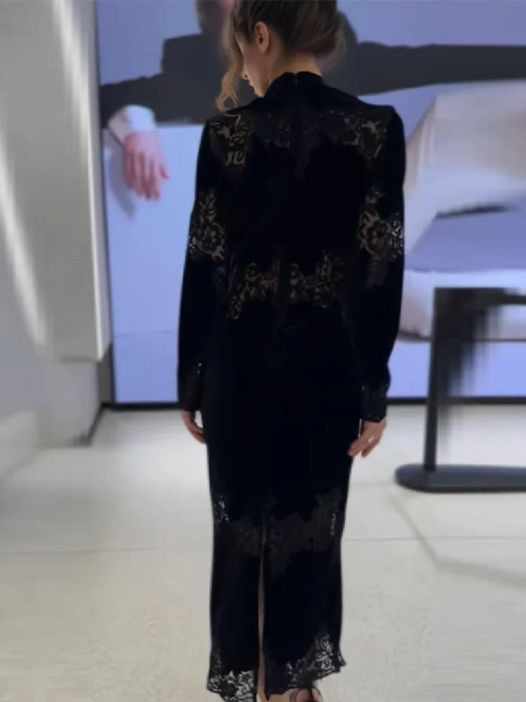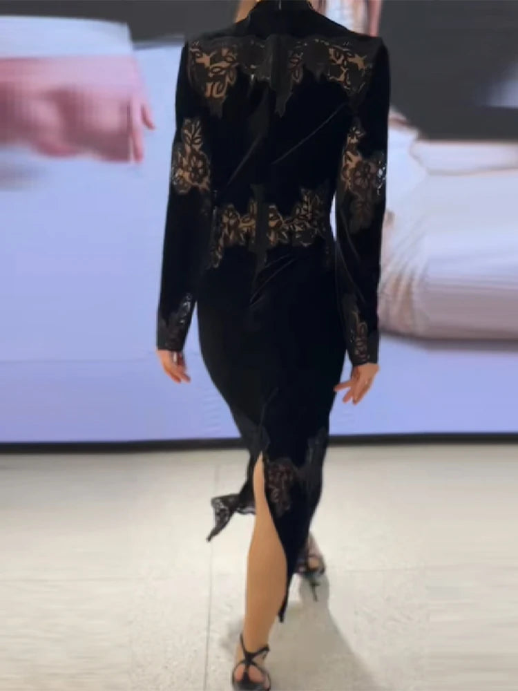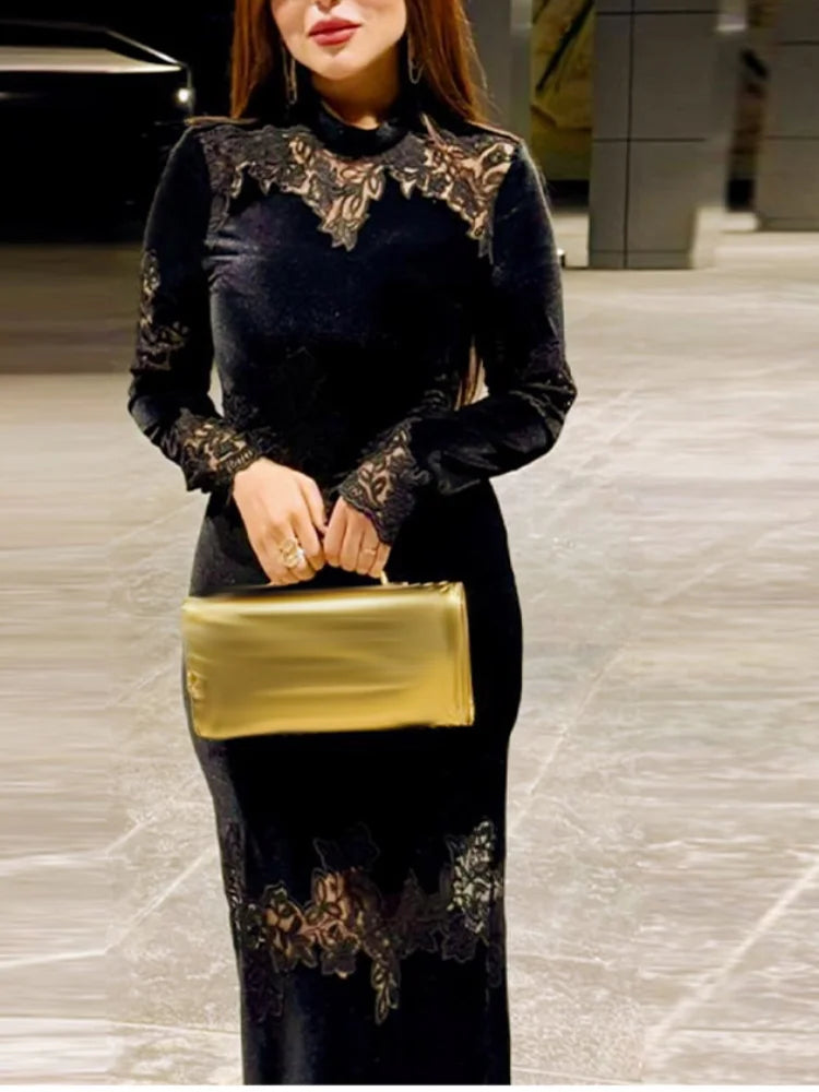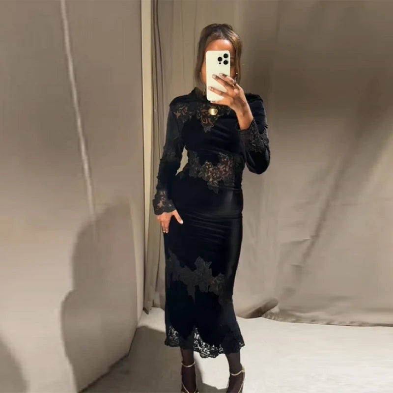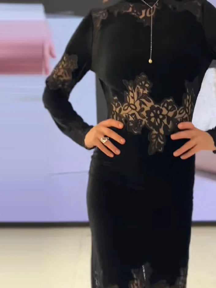 Women Elegant See Through Lace Long Dress Sexy Full Sleeve O-neck Slim Robe Fashion Split Skirt New Lady Club Party Commute Gown