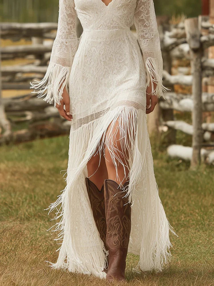 Elegant Vintage Women's Boho Tassel Dress White Lace V Neck Fringe Sleeve Autumn Fashion Party Dress Wedding Guest Maxi Dresses