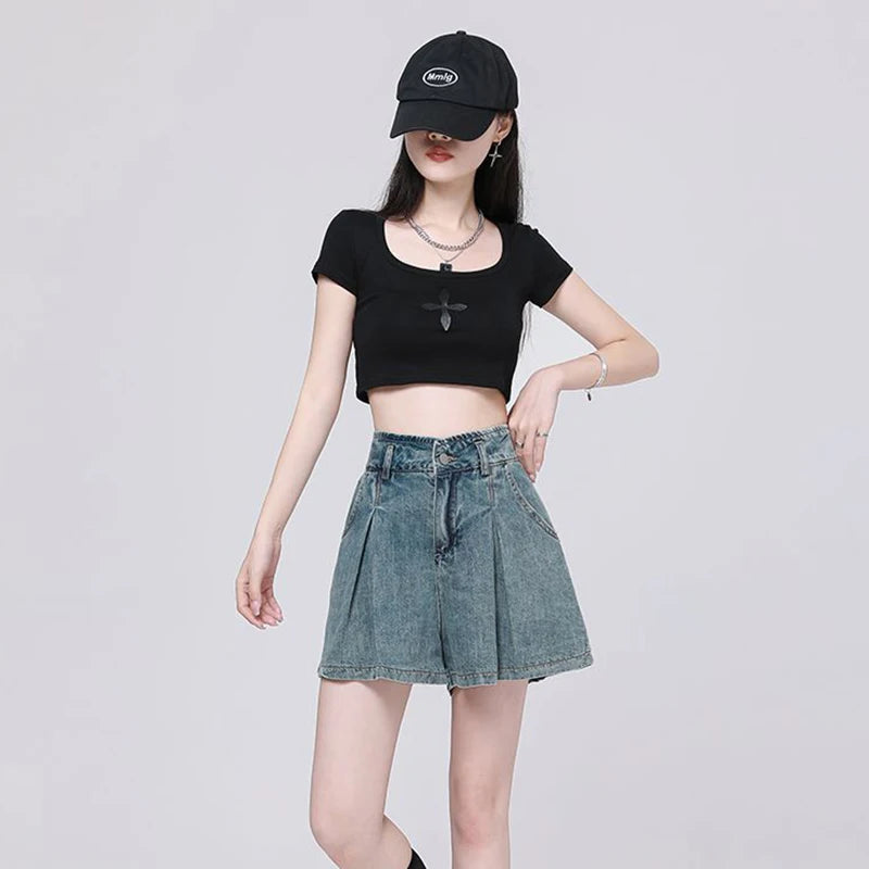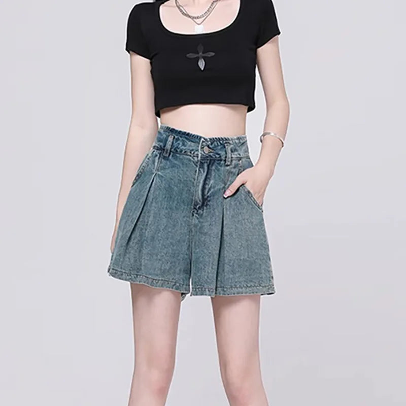 Korean Casual High Waisted Pleated Denim Shorts For Women Spring Summer Baggy Jeans Shorts Y2k A-Line Wide Leg Jeans