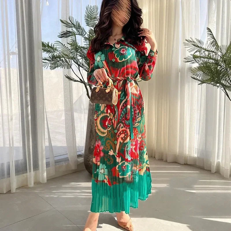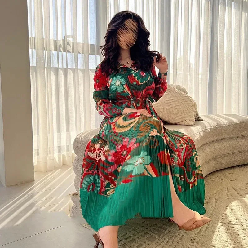 Miyake Pleated Dress 2024 Autumn New Loose Long Sleeved Printed Patchwork Mid Length Dress Summer
